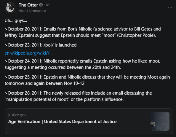 The inspirer of this post, , dropped such a bomb recently in his apparent (‘apparent’ because I frankly don’t have the time to go through all of the currently released files) discovery of a confirmation of 4chan creator Christopher Poole meeting and establishing rapport with the world’s least favorite Jeffrey.