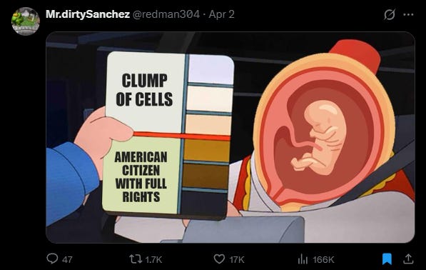 Now, I get it: you don’t think unborn people are people, and think it’s not just reasonable but necessary (for gender equality) to exclude them from legal personhood, the protections of the Constitution, and the 14th Amendment. Okay, that’s where you stand. We all know how abortion debates crash and burn in this thread, and we don’t need to have one tonight.