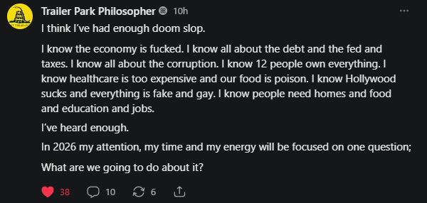We’re already supposed to understand that we live in the Dark Ages and that things suck. Then they suck and we get despondent.