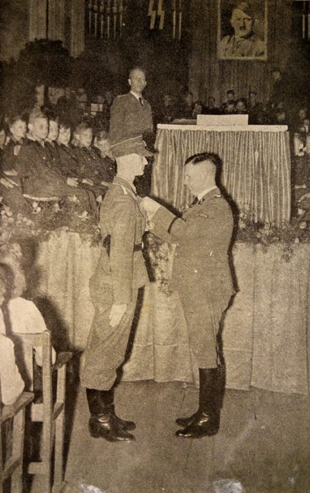 In this context, we would also like to point out that, not long ago, at a political meeting held on Dutch soil, the Iron Cross was awarded for the first time by one Dutchman to another. The Foreman of the Germanic SS in the Netherlands, SS-Standartenführer J.H. Feldmeijer, presented SS-Obersturmführer Rollema with the Iron Cross 2nd Class at an SS meeting in Maastricht, in recognition of demonstrated bravery on the Eastern Front.