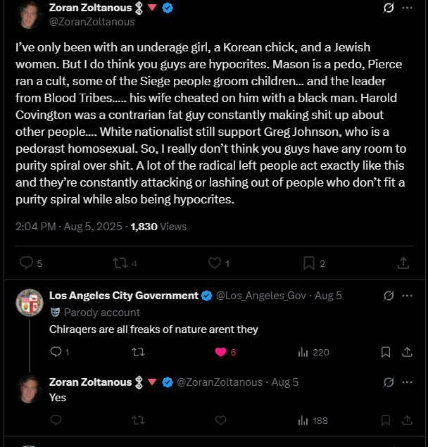When I first joined Substack it was the same old tired and deceptive fight of LEFT VS. RIGHT. In reality, it was all political bread and circuses. Now, the story is completely different. I am running into National Socialists all the time. The caveat is that they are usually writing into the void. They may have something to say, but they can’t reach an audience because they simply cannot beat the algorithm. Another realization that I have come across is the fact that many of the so-called “National Socialists” or “Fascists” are complete degenerates. In the case of Zoran Zoltanous, one of the most prominent “Fascist” writers, he’s actually a race-mixing pedophile.