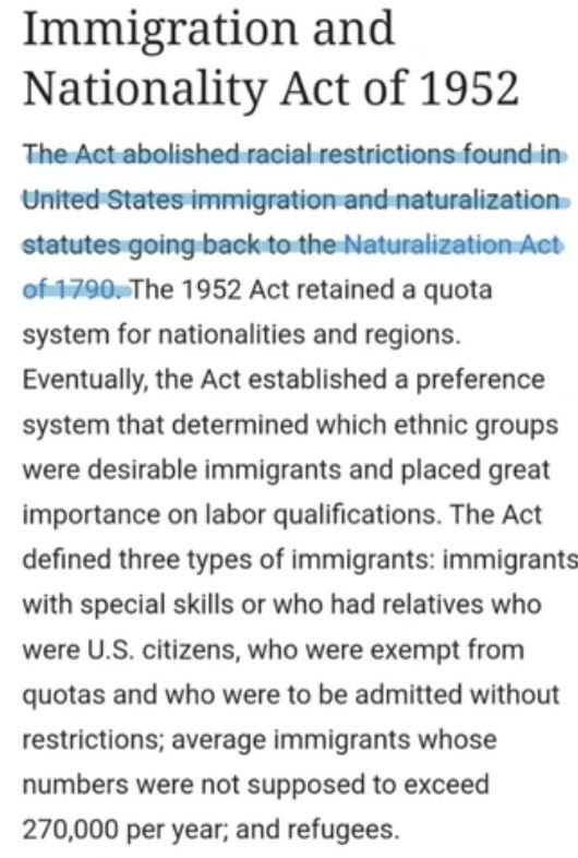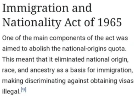 However, this was was not seen as “effective” enough and so the Immigration and Nationality Act of 1965 (otherwise know as the Hart-Celler Act) was enacted. This is the prevailing piece of immigration legislature today.