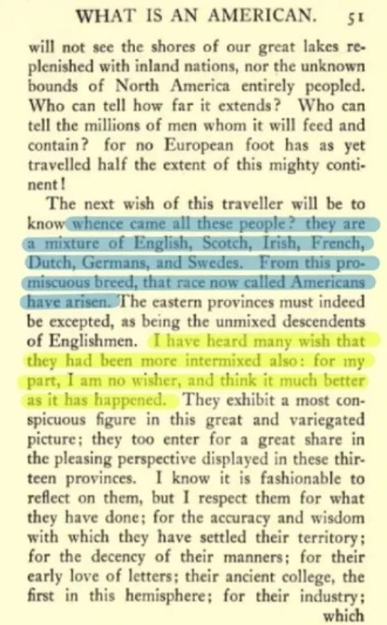 But enough of that, lets get into the meat of the argument. The first example of this “melting pot” comes from J. Hector St. John de Crèvecœur’s Letters from an American Farmer (highlighted in blue):