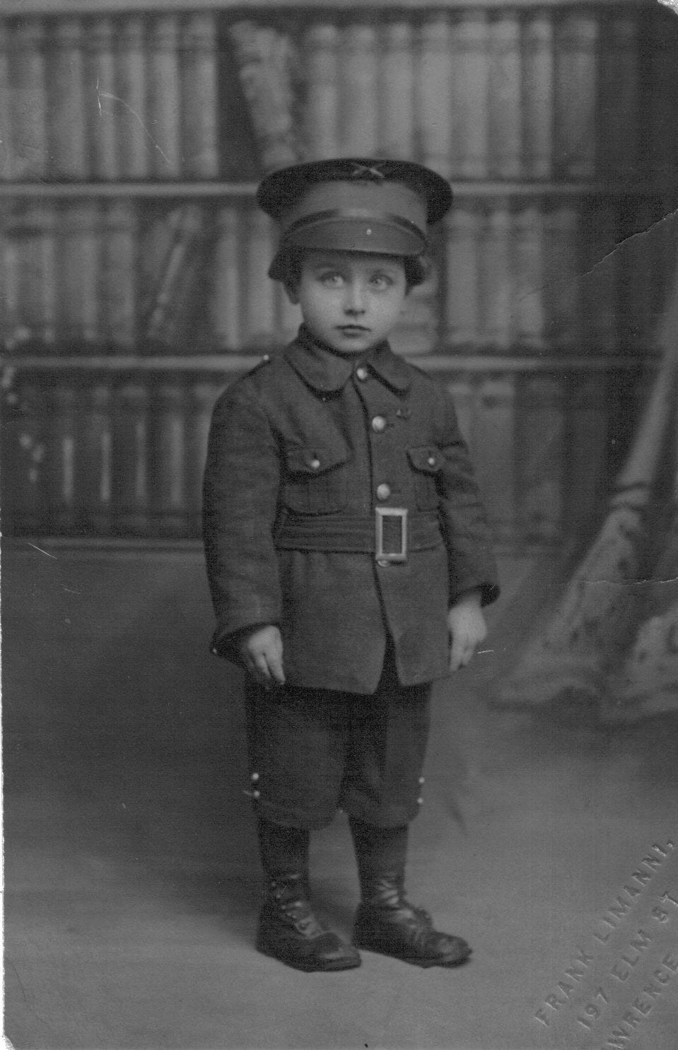In this photograph below, Albert stands alone, small in stature yet deliberate in bearing. The uniform he wears is clearly too mature for him, its weight resting awkwardly on narrow shoulders, yet he does not slump beneath it. He stands upright, feet planted, hands still, eyes forward. There is no playfulness in the pose, no indulgence in childhood. Instead, there is attention—an early familiarity with expectation.