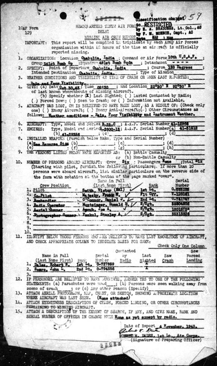 He was stationed in India, far from both the mills of New England and the stone towns of his family’s origin. From there, his service carried him into the skies over China, along routes defined by distance, weather, and necessity rather than borders familiar to him. The terrain below was foreign, vast, and unforgiving, demanding precision and calm from both crew and machine.