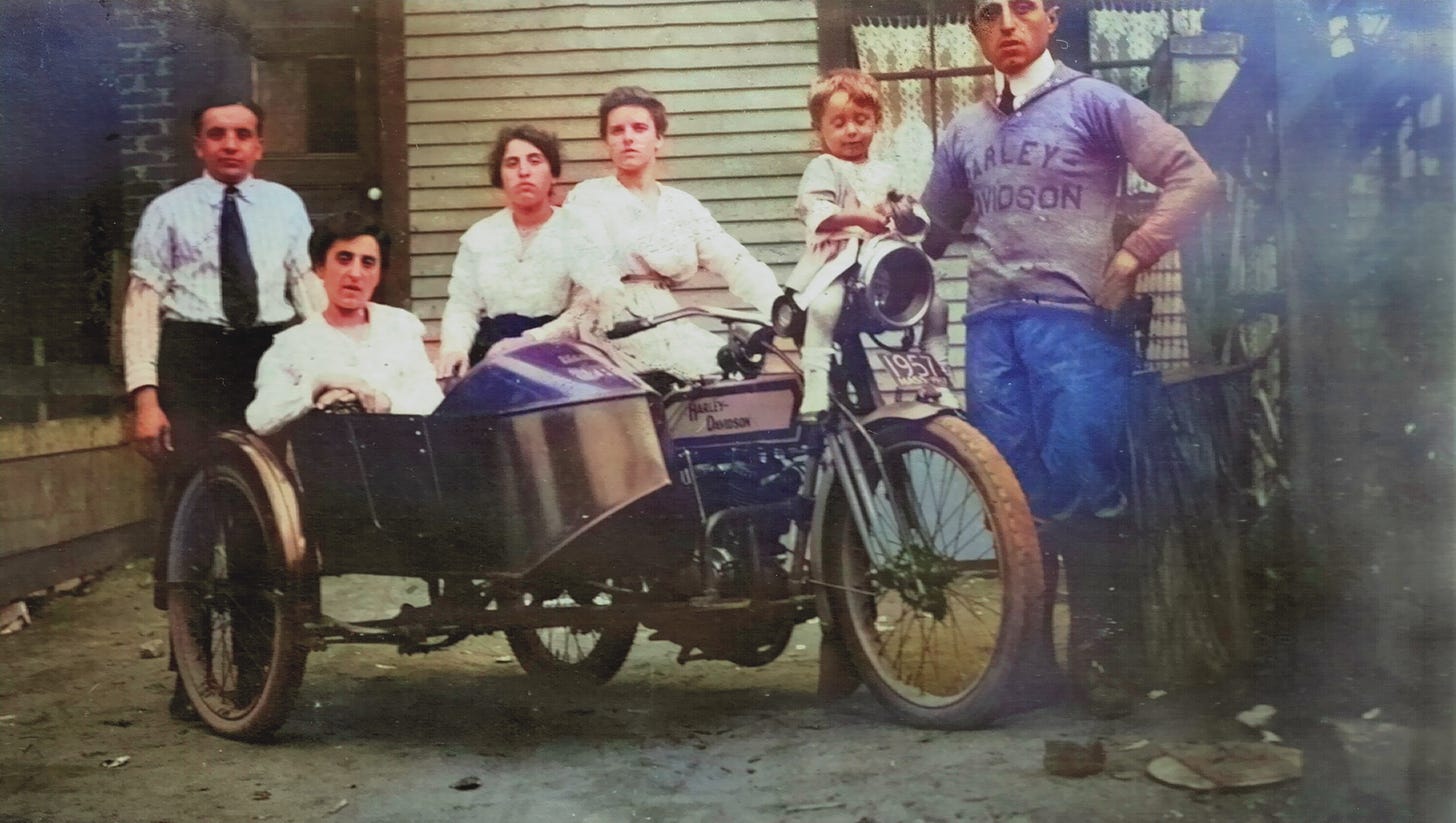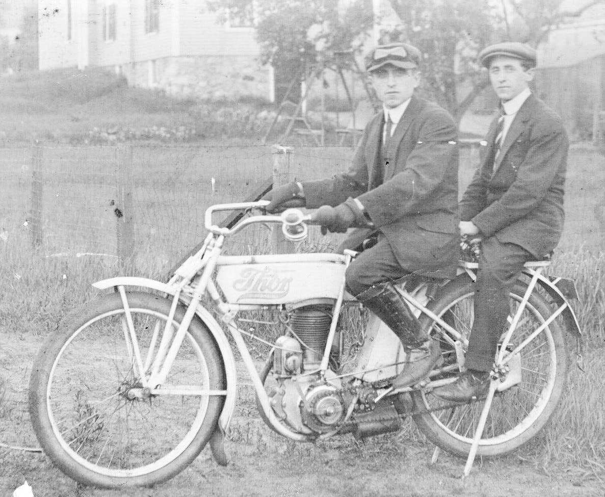 When he was not tending the mill’s machinery, he turned his attention elsewhere. Drawn to motion and mechanics beyond the factory floor, he became an avid motorcyclist. Where the mill bound him to schedules and walls, the motorcycle offered movement, independence, and speed—a modern expression of the same instinct that once drove him across an ocean. In engines and open roads, he found both mastery and release, a balance between duty and freedom that defined his life in the new world.