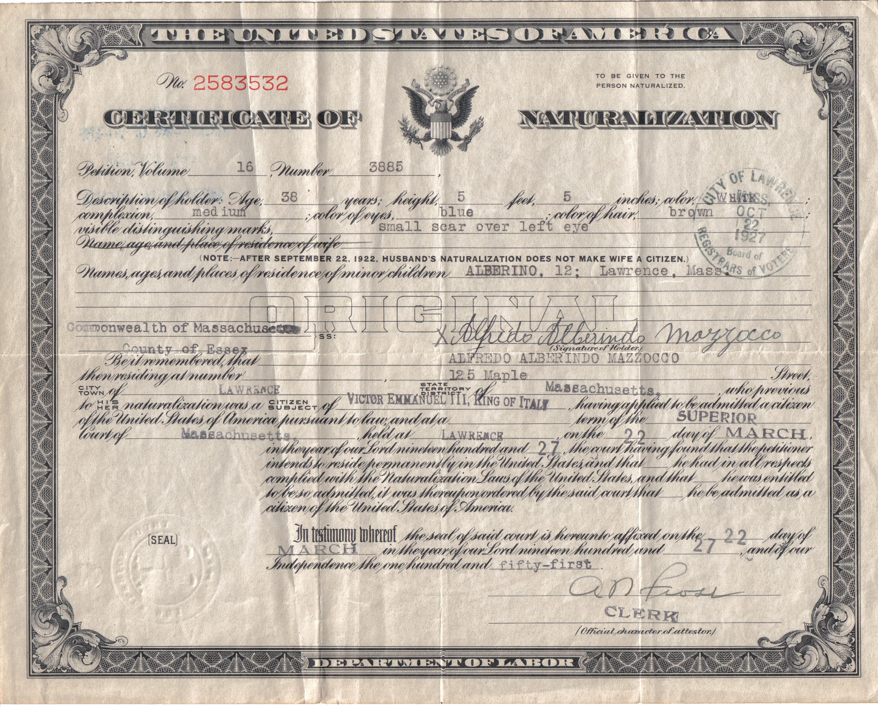On March 22nd, 1927, after more than two decades of labor and settled life in Lawrence, Alfred became a naturalized citizen of the United States. The oath marked the final crossing of a journey that had begun in the stone fortress of Cerro al Volturno and passed through the mills of the Merrimack Valley.