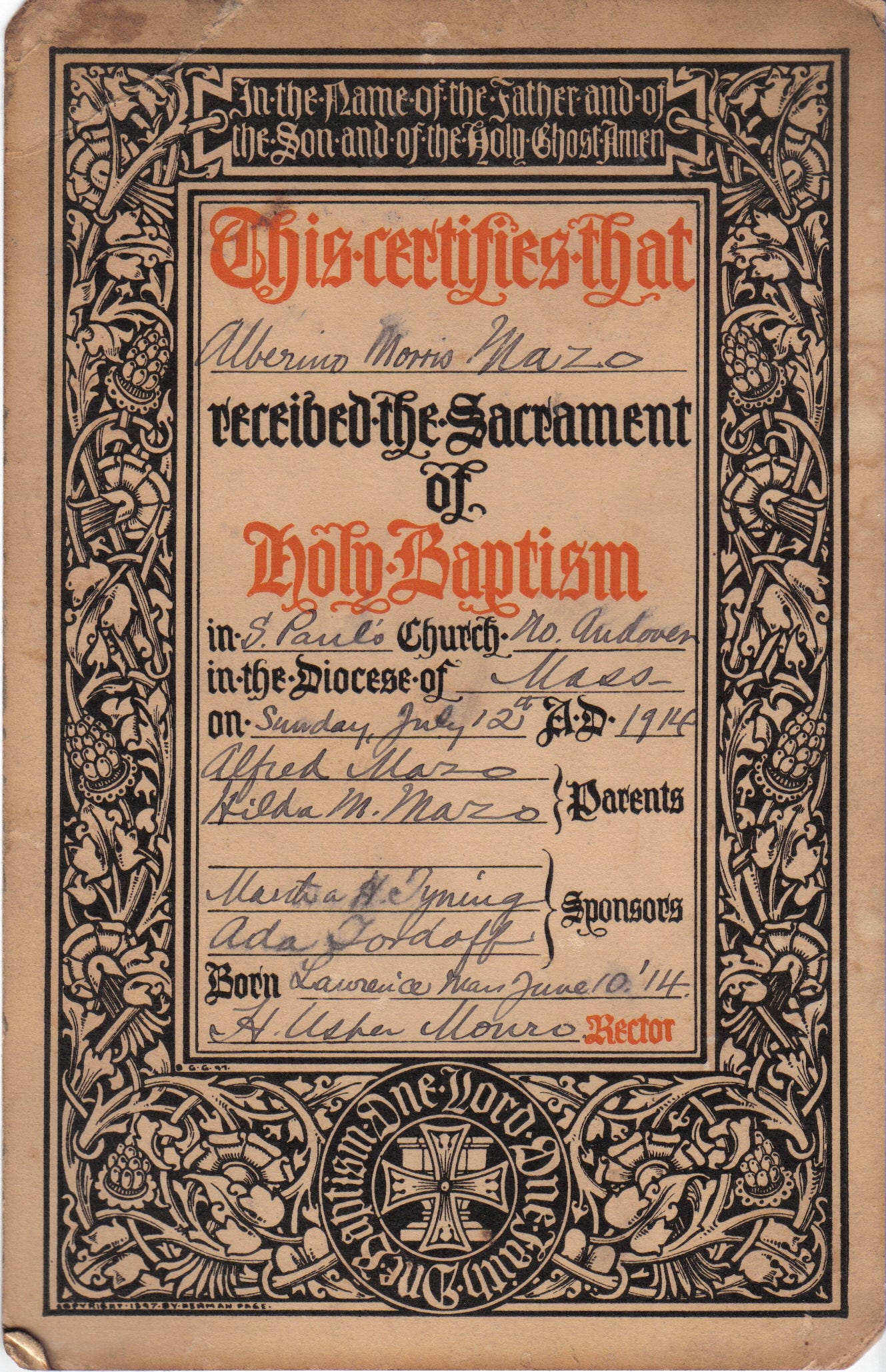 His baptismal record bore an iron cross, a simple and austere mark of the faith into which Albert Morris Mazo was received. It was not ornamental, but plain and enduring—fitting for a family shaped by labor, restraint, and continuity rather than display. The cross stood as a sign of sacrifice and permanence, echoing the same values that had carried the line from the stone strongholds of Molise to the mill towns of New England.