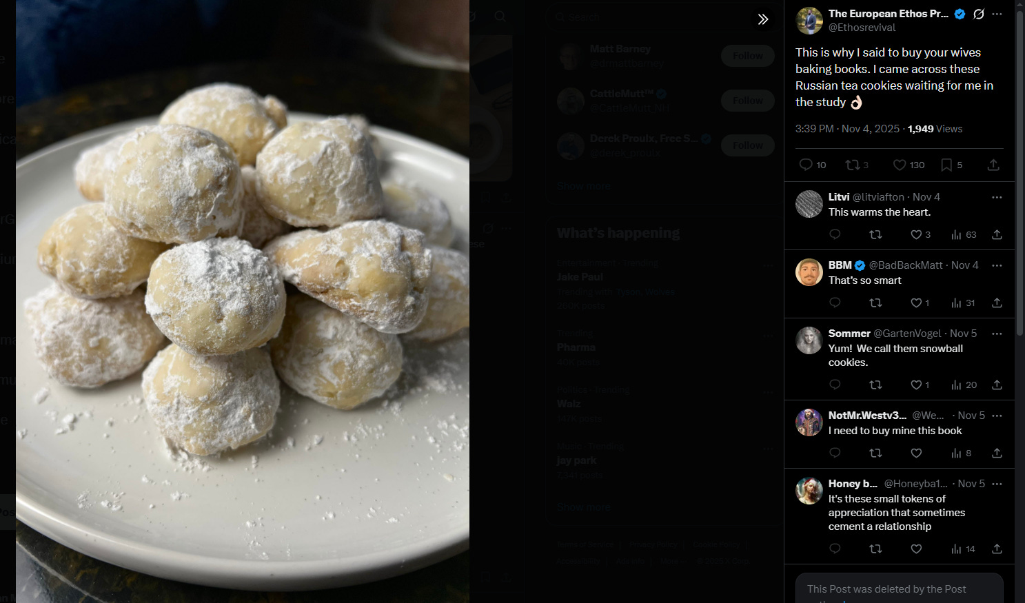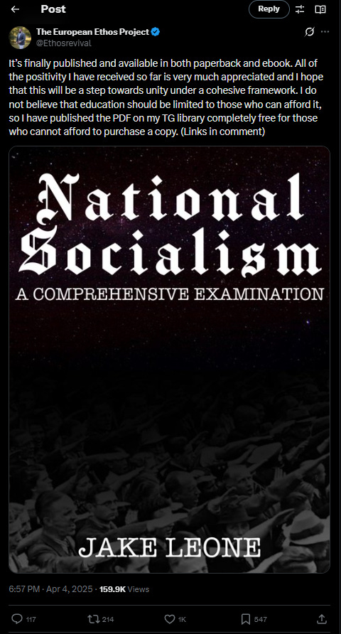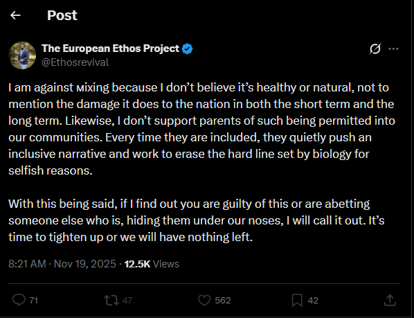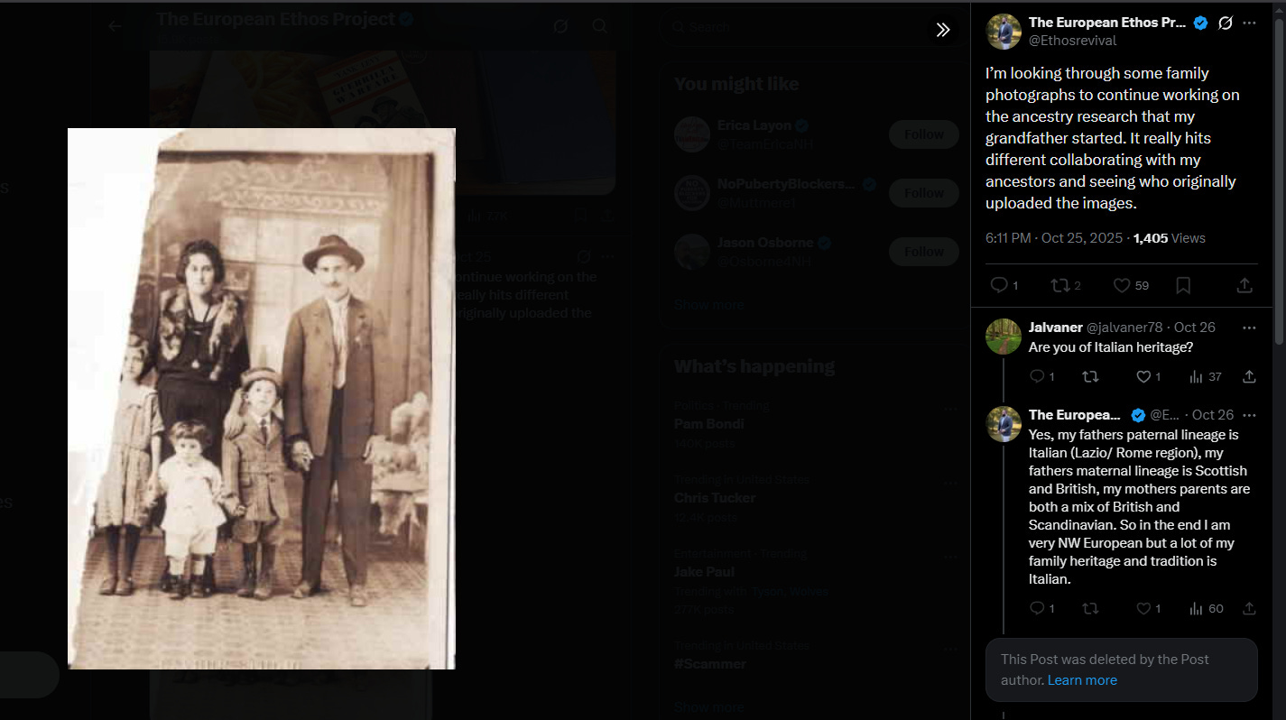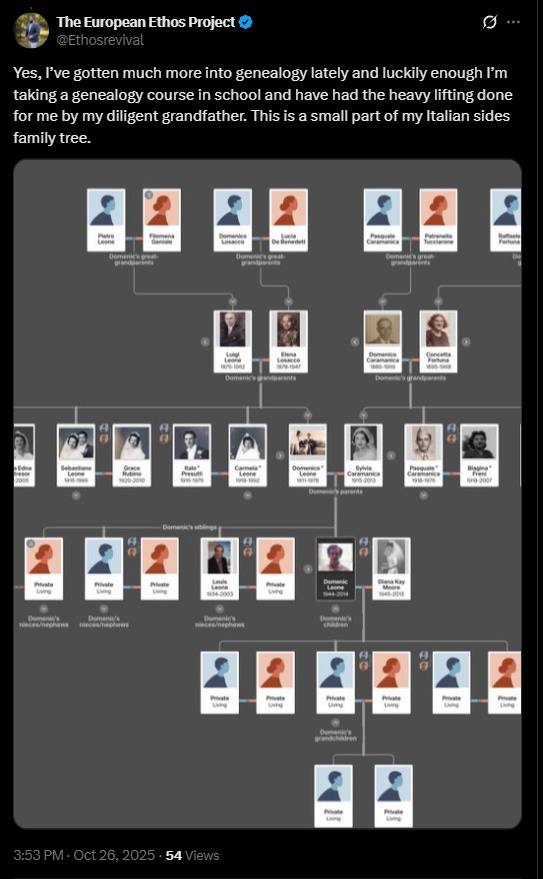 This account was created on September 13th, 2024. The first username he ever used was @EuropeanEthos which he kept until Mid-September. By early October, he had changed his username to @Ethos_Project and finally by mid-October, he had changed it to what it is now, Ethosrevival. This is also the name username that he uses on Substack, Jake Leone.