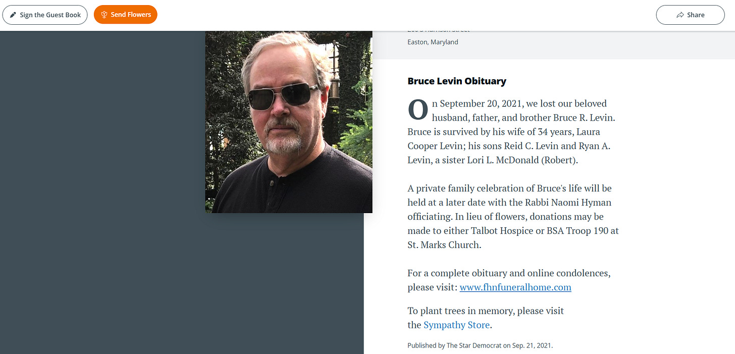 Looking further into Reid Levin, I was able to uncover his father’s obituary from 2021. And in that obituary it mentions that his father, Bruce Levin, was given a jewish funeral that was overseen by rabbi Naomi Hyman, who is a rabbi at the Unitarian Universalist Fellowship of Easton, MD (earlier I mentioned that Ralph Friedman had his funeral services at East Short Unitarian Universalist Church).155