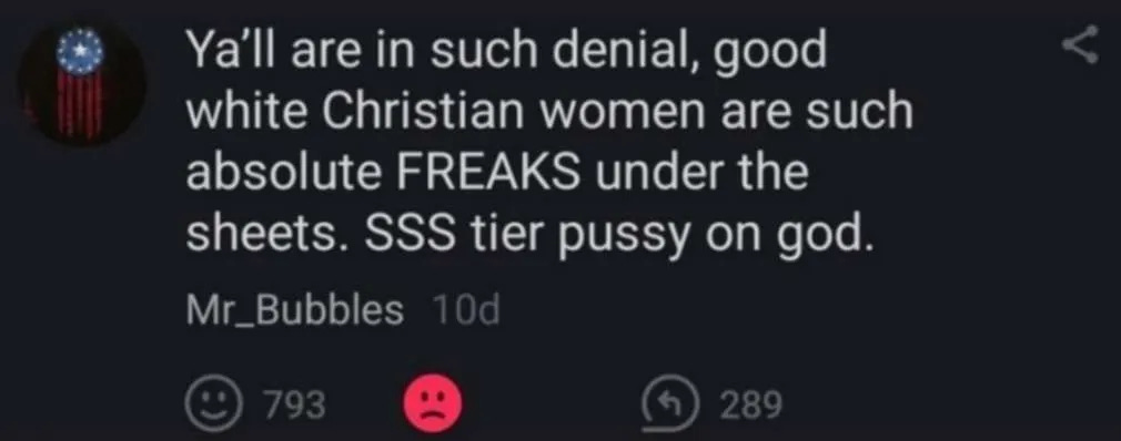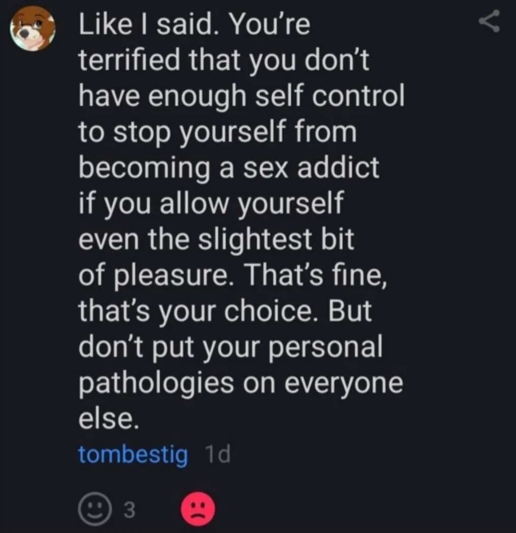 However, I do think there’s more to it than that. I think part of it is just the same issue that plagues all midwits: they want to be smart but they aren’t, so they end up parroting things they hear to sound smart. I think another important part is that many of them probably recognize, on some level, that their infatuation with porn is weird and abnormal, and that it results only in loneliness and isolation. By saying someone is projecting, they can lie to themselves and say they aren’t weird and that they aren’t alone in their perverse misery. It’s very sad, really, and I think this is also why there are so many group chats where all the members do is share porn and RP. They yearn for companionship, but they know that if they were to act like this in public, they would be shunned.